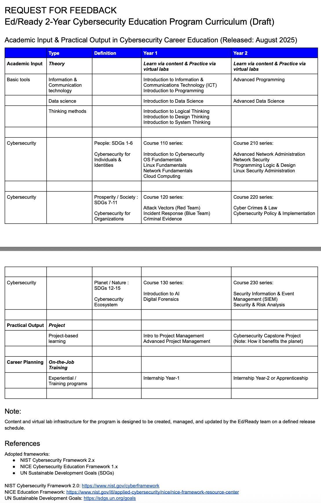 The following draft proposal is for a 2-Year Cybersecurity Education Program that is being designed for adoption by higher education institutions, such as colleges and universities. The program and content will be built, updated, and shared with education providers and practitioners who intend to adopt this curriculum. We will also be looking for sponsors and supporters to maintain this program for the adopters at the higher education institutions.